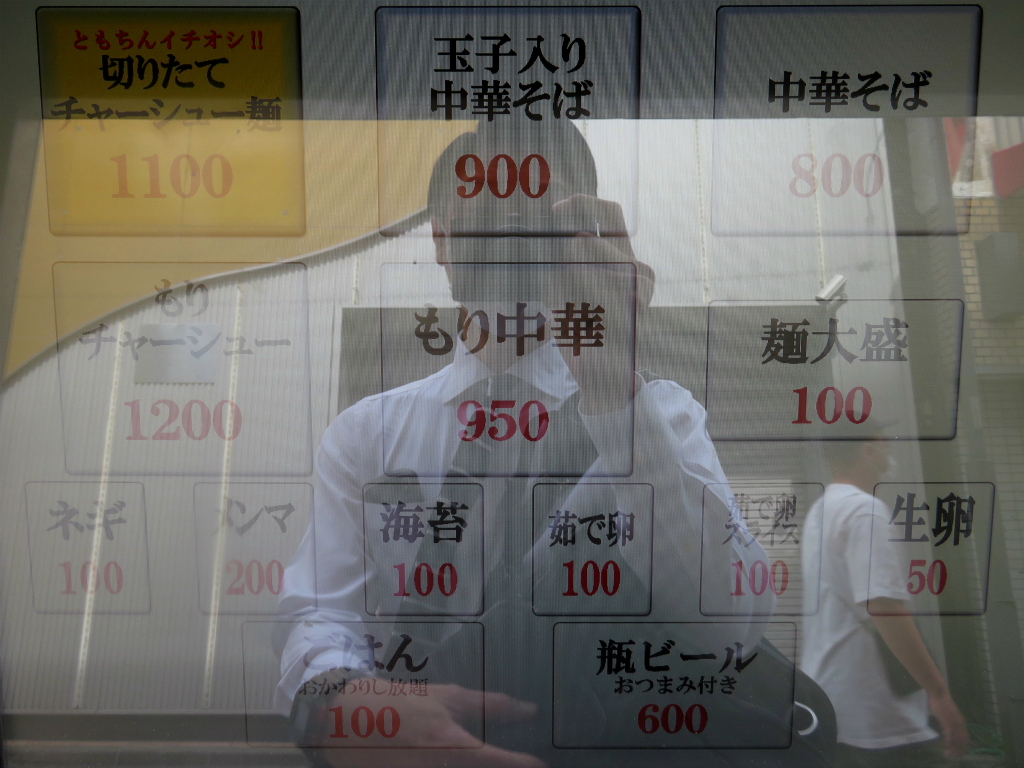 きっと店長大曾根悠二郎氏 a.k.a. にぼし悠二郎の奥様の仕事なんだろうと思いを巡らせながら、前回と同じように券売機の映り込みは相変わらず、いつものように映り込んでハイチーズってな具合にええ、もりよりもやっぱ中華を選びますゼ。