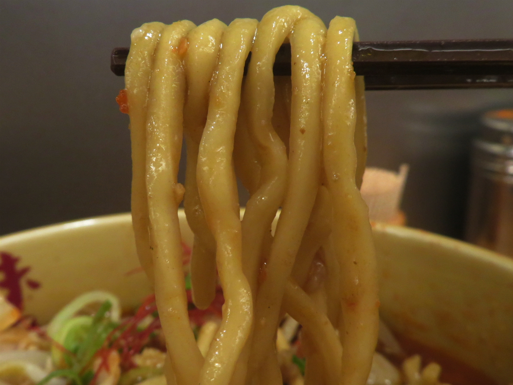 さて、「辛みそラーメン」。麺は新宿だるま製麺謹製って確 to da 認。自分の最適解、生卵2個で 改めてスキヤキスタイル。