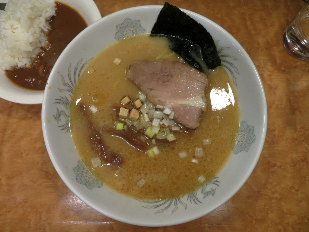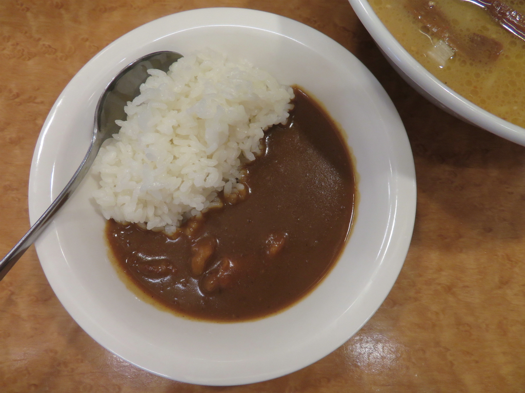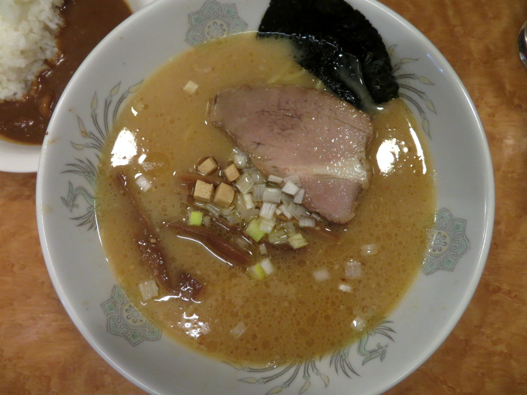 さて、「味噌らぁめん」。ご飯 少な目、ミニカレーの上にチャーシュー(何この厚み)をサルベージするところから 再開しよう。
