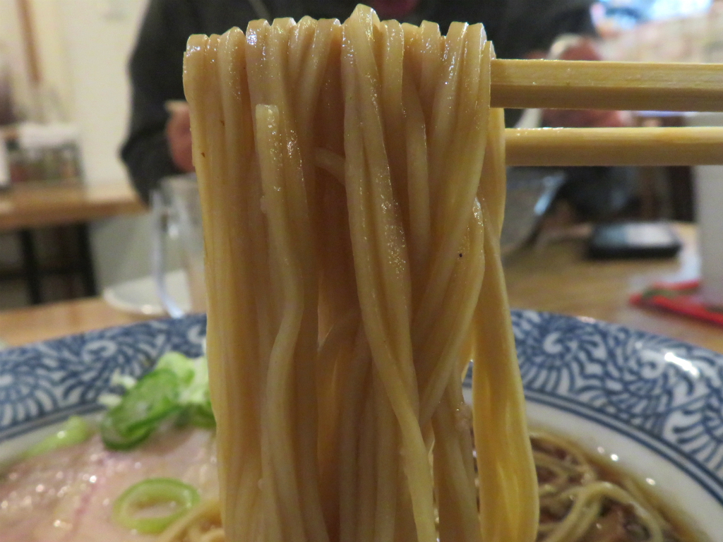 さて、「正油らーめん 元味(細麺)」。焼き立てカリフリチャーシューで日本酒からの店員さんのレコメン。啜る、緑の五本指。