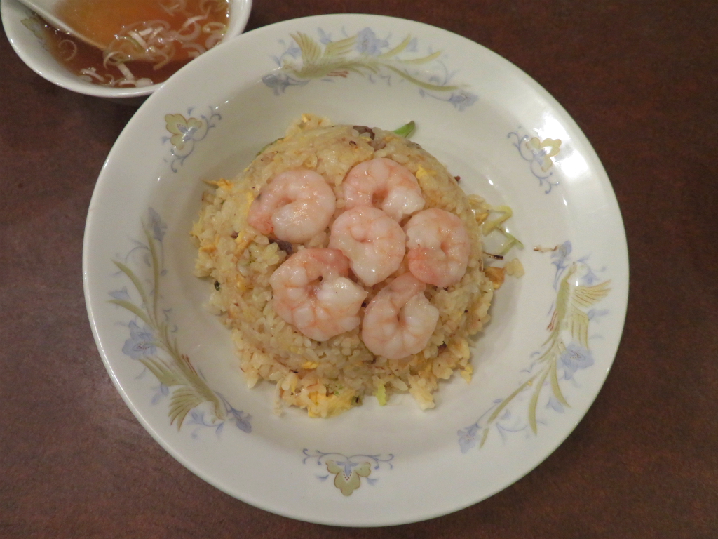 レバニラ炒め、ギョウザはビールで一気に流し込み、ピーマンと肉細切り炒め、肉細切り焼きソバは紹興酒で一気に流し込みゲップでみんなにセイハローしたらエビチャーハン。この時期に訪問する理由の一つ、チャーハンがちゃんとありますゼ。