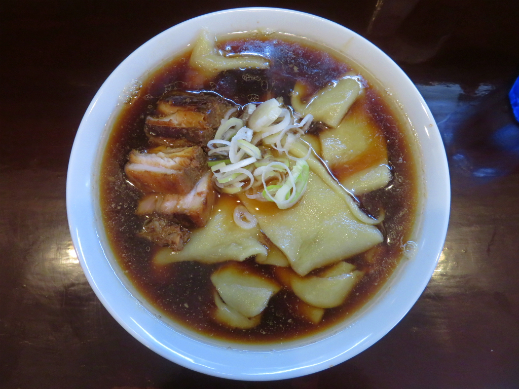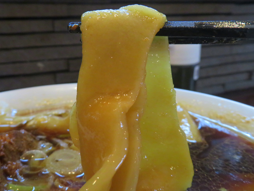 さて「ラーメン」。店内撮影禁止でメニュー写真なし。生姜醬油を泳ぐ、啜るに啜れない極太を超えた極太麺ライカひもかわ。