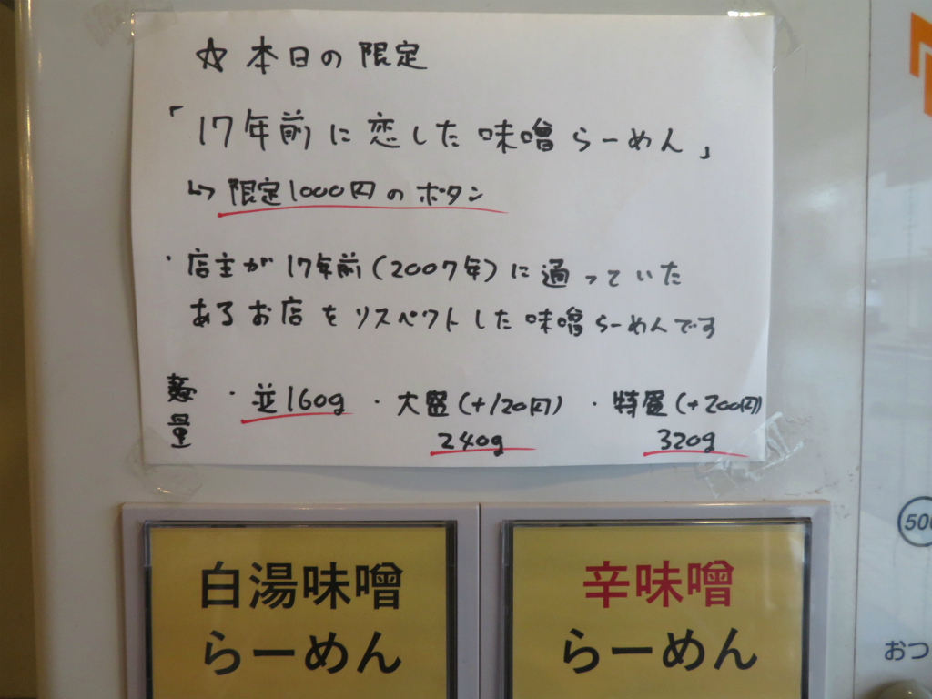 ■注文:17年前に恋した味噌らーめん(¥1000)、ほか