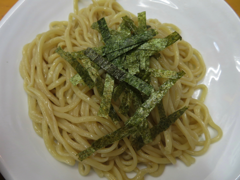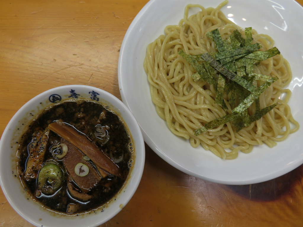 さて、「つけそば」。カウンター越しに目に入る寸胴の中身。それを掻き回す一挙手一投足は、その出自よろしくまるで家系。