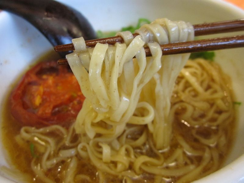 ピロピロッとした平打ちの太麺は、キリンのような模様が特徴的な自家製麺。茹で加減は柔めの設定(ブレかな?)ながら、個人的には楽しめましたね( ゚Д゚)ンマイ でも、もう少し短めの方が食べやすいかも?引っ張り出しながら、汁を飛ばしながら汗。