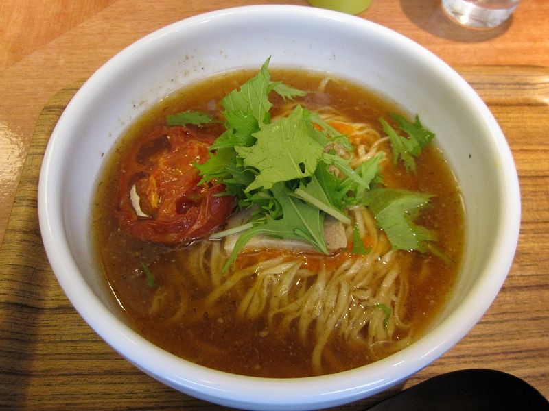 既出な情報ですが、メニューはラーメン、野菜豆乳つけめん、4チーズまぜそばの三種類。ソレにトッピングとご飯類が準備されています…が、今回は左上の法則に従ってラーメンをチョイスヽ(・∀・)ノ イエイ そして追加でローストトマトを頂戴しました。ふふふ、大つけ麺博@日比谷 のイメージが強くてね!