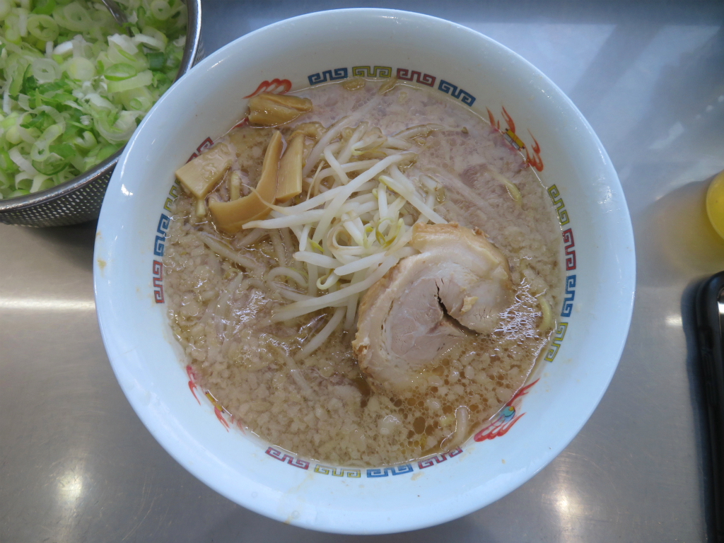 さて、「ラーメン」。隣の学生がもやしダブルを食べてて 完全に二郎の様相。おっし、こんもりとネギを乗せたら啜り倒して候。