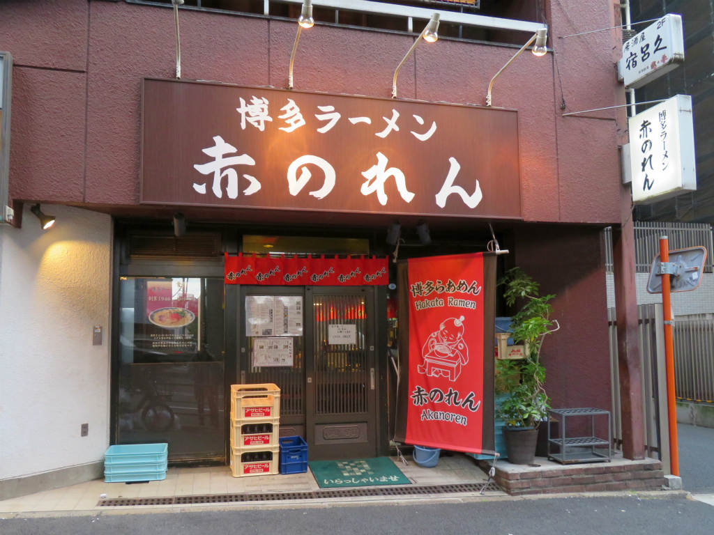 六本木通り沿い、博多ラーメンの源流とも言われる系譜。創業1978年(昭和53年)、「博多麺房 赤のれん」西麻布本店。