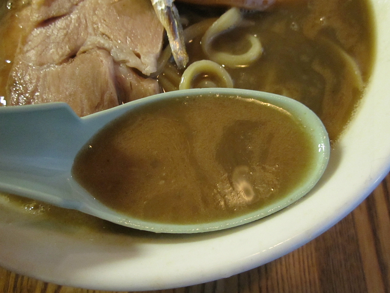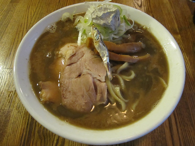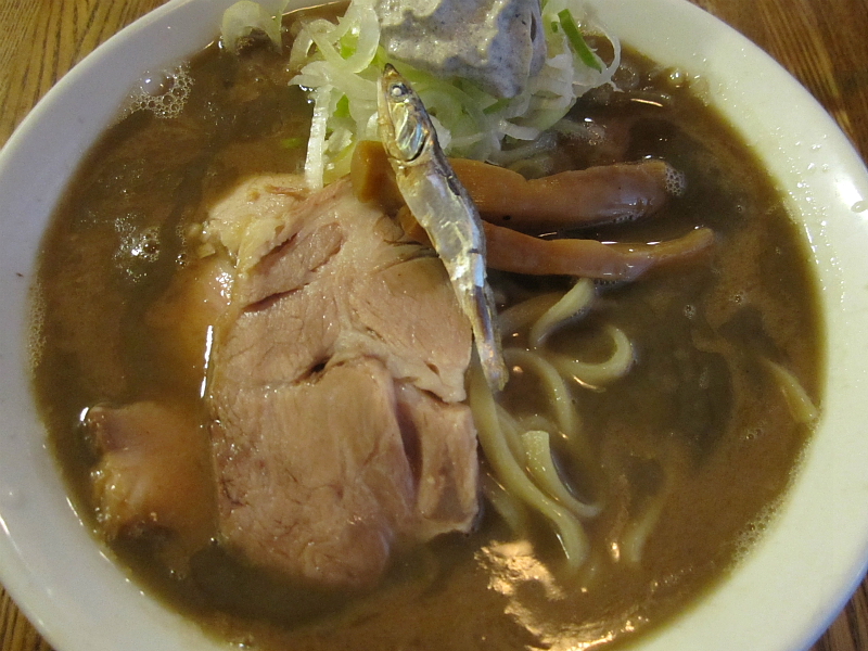大橋製麺謹製の平打ち太麺は短め仕様のデロンとしたやーつ。具は叉焼、メンマ、煮干一匹、ネギの上・・・そう、煮干のホイップが後半の印象をマイルドマイルドウェストに味変しますゼ。てか、コレはなかなか前衛的な仕掛けかもね。