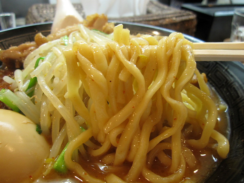 やや平打ちの太麺はしっかりと茹でられており、ムッチリと膨らんでいる感じ。選べる仕様は野菜増し(無料)、辛口で。