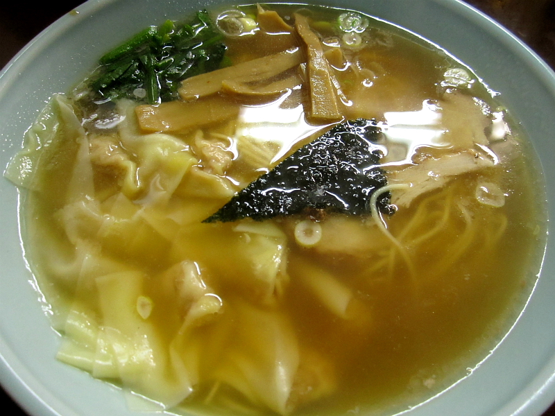 さて、動物系を主体とした中華上湯みたいな様相、色付く程度の醤油がスープ本来の味を確実にお届け。頼りない細麺を啜りながら、堪らずにワンタンを放り込みはふはふ、ギョーザを放り込みはふはふ、大人の幸せを咀嚼して行きますゼ。