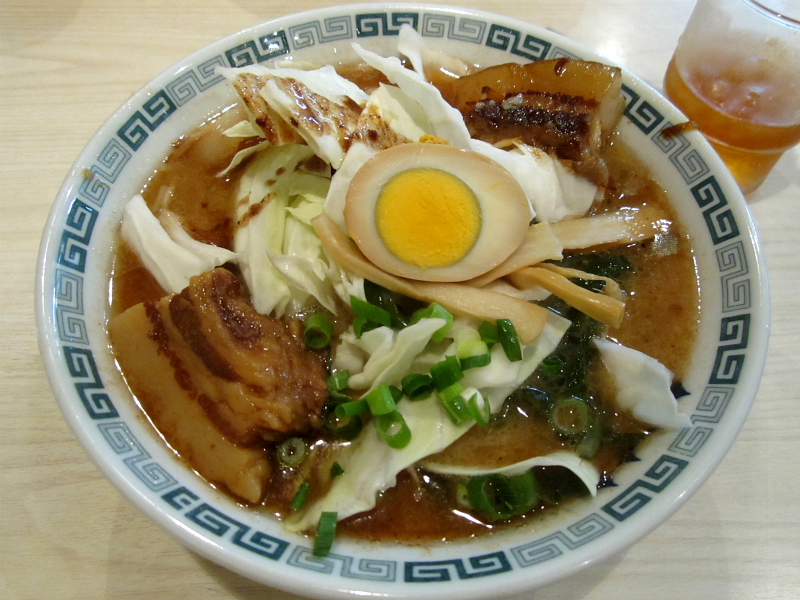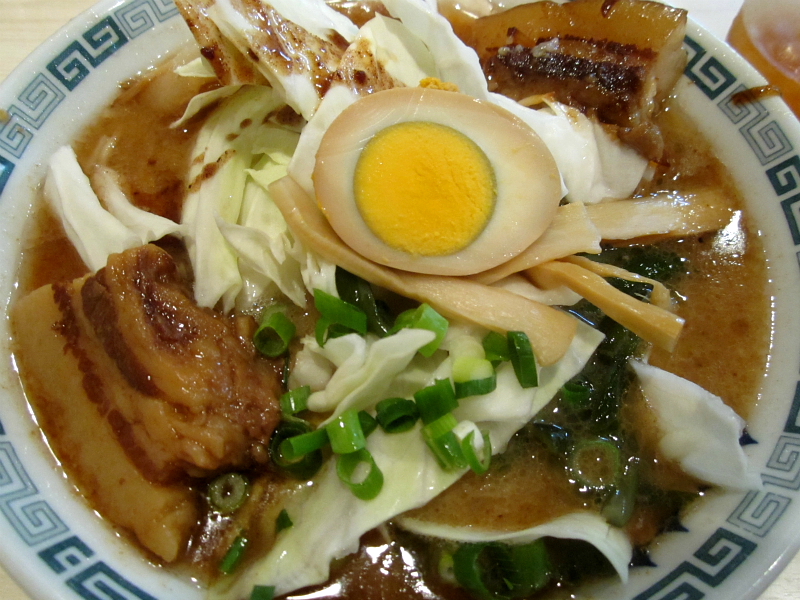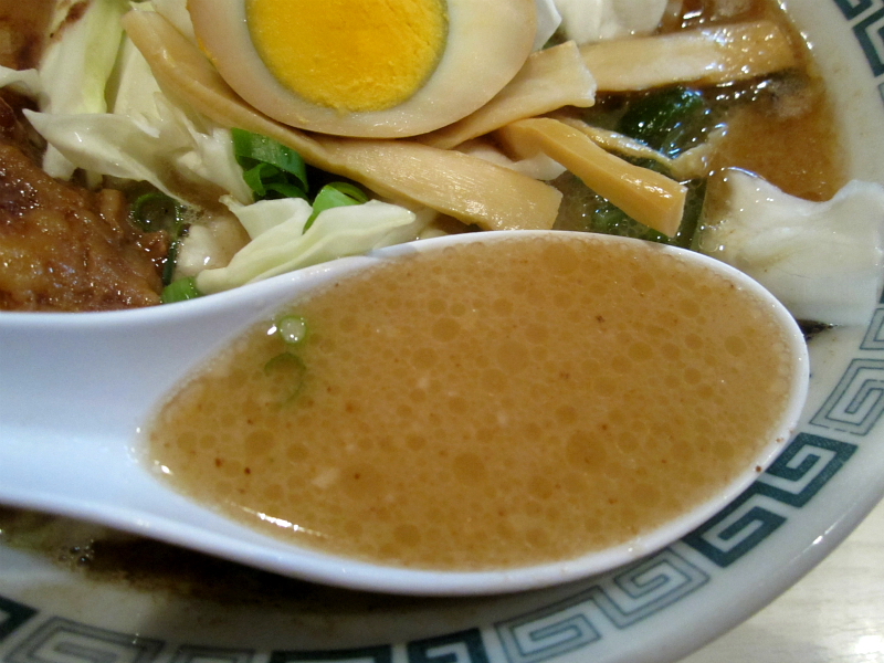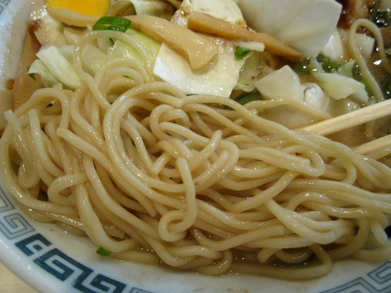 ぼそぼそっとした食感が印象的な太麺は昔とはちょっと印象が異なる感じですゼ。でも、好き好き。太肉 a.k.a. 豚角煮を一齧りしたら、生キャベツでチェイス。茎ワカメ、メンマ、わけぎ、固茹で味玉・・・じゃなく、ルータンがセット。我欲す替玉。