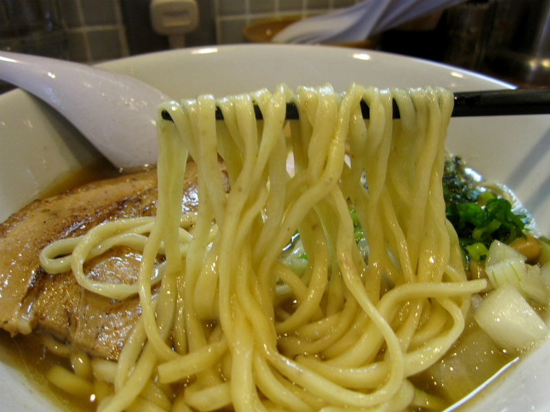 無作為な厚みが印象的な手揉み風の平打ち太麺は、咀嚼を重ねる毎に小麦の風味が膨らむやーつ。炙り叉焼、小ネギ、玉ネギ、メンマ、ナルト、味玉a.k.a.感謝の塊魂、海苔・・・が溶け出せば、海のフレイバがより一層分厚くなりますゼ。