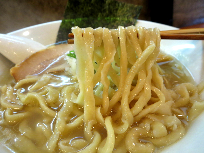 鯛が出過ぎることもなく、塩が突き抜けることもないけれど、程好く尖がった味わいの中に店主のアンビシャスが窺い知れますゼ。看板にも掲げられた自家製麺は、丁寧な手揉みが入れられた極太麺。具は叉焼、三角メンマ、青ネギ、海苔。