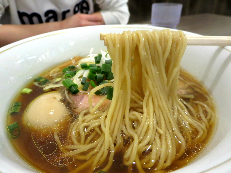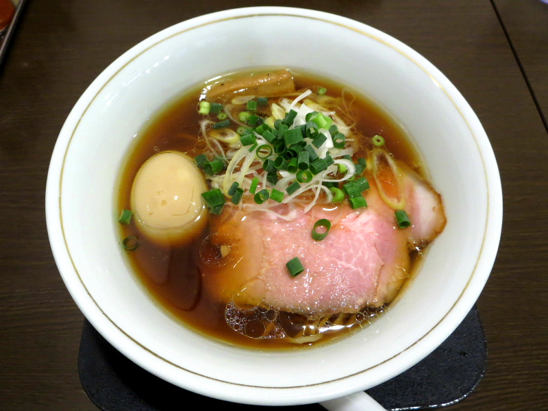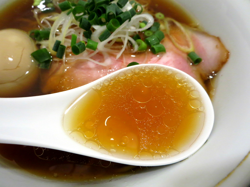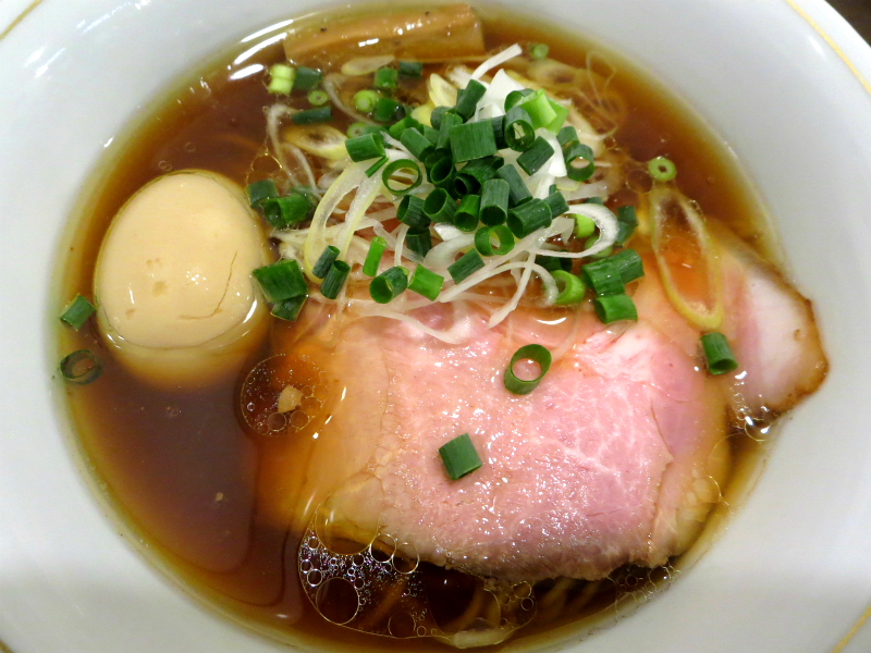 さて、濃淡両極端なメニューから、前述の通り変わったとされる「味玉醤油らーめん」をチョイス。予習していたソレともまた違うソレは、淡麗ながら濃醇とか矛盾したことを恥ずかしげもなく言っておきますゼ。鶏よりも先に届く魚、からの醤油。