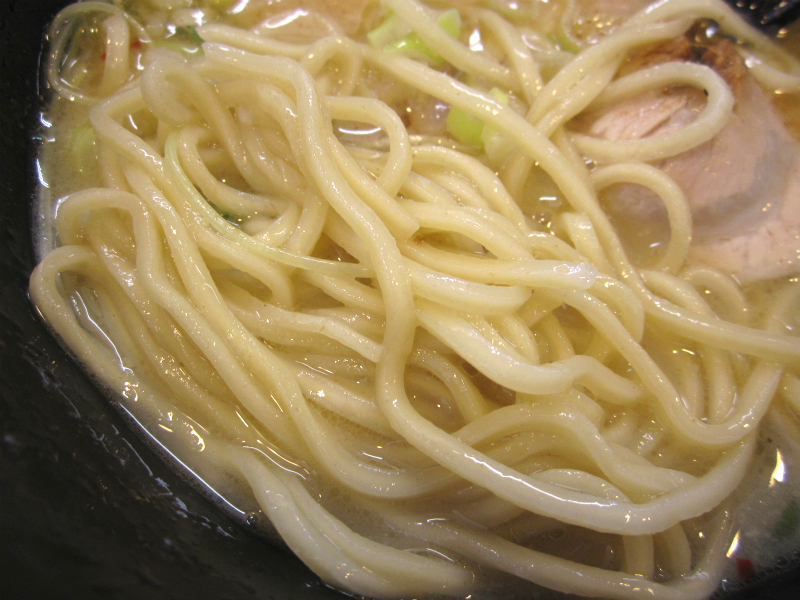 つるつるとした麺肌、太く平打ちな形状でもちもちッとしたタイプ。鶏白湯との相性は言わずもがな。製麺所の知識など乏しいクセに、食後に尋ねてみると・・・私でも知っている京都の「棣鄂」とのこと。