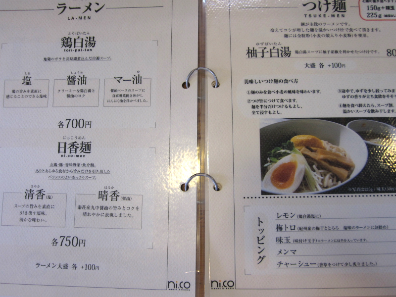 さて、「季節の限定つけ麺」、「柚子白湯(つけ麺)」・・・ラーメンにおいても、「鶏白湯」「日香麺」とまたしても悩ましいメニューたち。ラーメンなんかは味がエとセとラと選べちゃうあたり、一回伺ったダケじゃ未食扱いと言われそうな感じね。