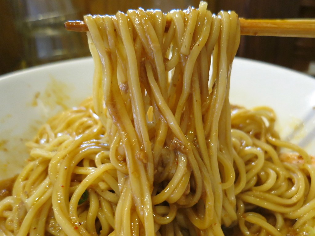 さて、「冷やし味噌油そば」。名前の通りちゃんと冷たいんだが、海老入りラー油が確実に辛辣で結局南極赤目の汗達磨。
