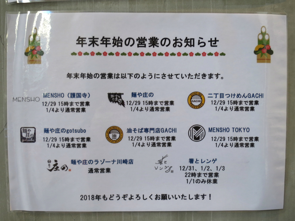 MENSHOグループの年始情報を振り返ってみると、ラゾーナ川崎と阿佐ヶ谷のビーンズてくて、施設以外の店舗は1/4からだったわって肩を落とす君と僕。うん、2016年末にオープンした「MENSHO」に結構アレしてしまったのは内緒の話ですゼ。