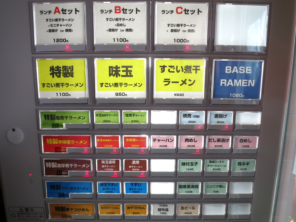 そんな話題の絶えない凪グループの田町店。券売機と対峙するとミニチャーハン、唐揚げ、焼売セットなんてのがあって一気に気持ちが高揚するが、現在ソフトオープン中につき ボミングスーン状態。おおう、イケてる方の隣席に失礼しますゼ。
