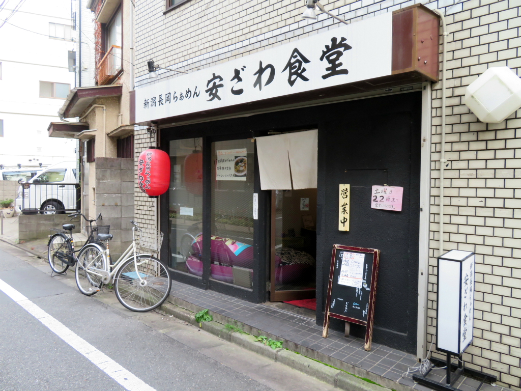 最寄り駅、東武東上線の上板橋からそこそこ歩く 住宅街の中に行列をつくる人気店。「新潟長岡らぁめん 安ざわ食堂」。