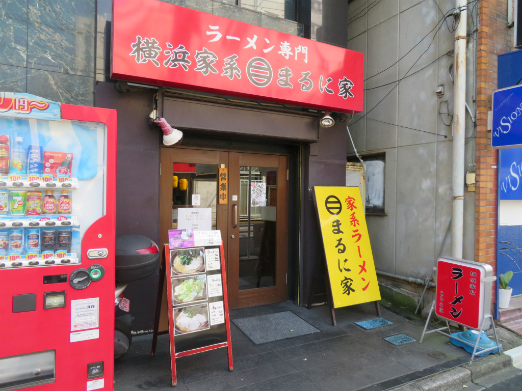 最寄は八王子駅、富士見町商店会に掛かる家系の暖簾。創業2015年(平成27年)ラーメン専門「横浜家系 まるに家」。