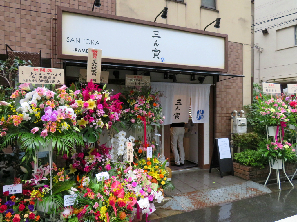 昨年の某横浜の新店もそんなストーリーを感じて胸が熱かった。思いっきし系統こそ違えど想いは同じ、何となしに重ねながら丁度池袋で仕事があった雨降りの火曜日。雨露に濡れて乱反射、燦然と輝く名店からの祝い花が 証拠証明ですゼ。