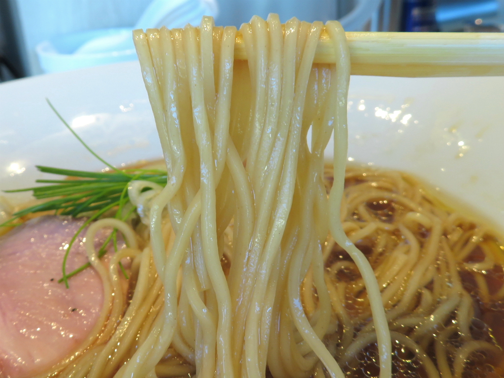 さて、「地鶏としじみの中華蕎麦(醤油)」。それを言うなら貝じゃなく回だからって、手揉みの人はやっぱり手揉み太麺なん。