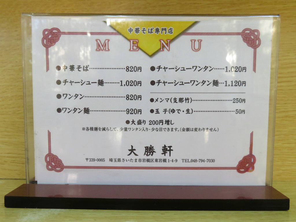 最寄は東岩槻駅、永福町大勝軒の系譜にある人気店。創業1975年(昭和50年)、中華そば専門店「大勝軒」東岩槻店。