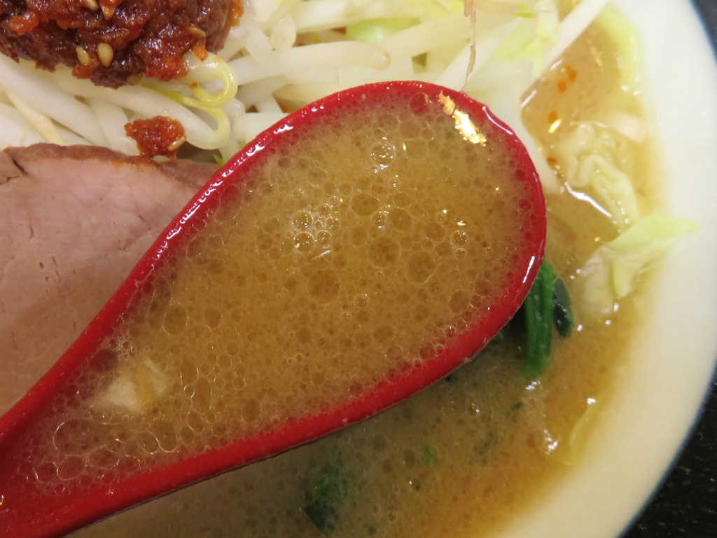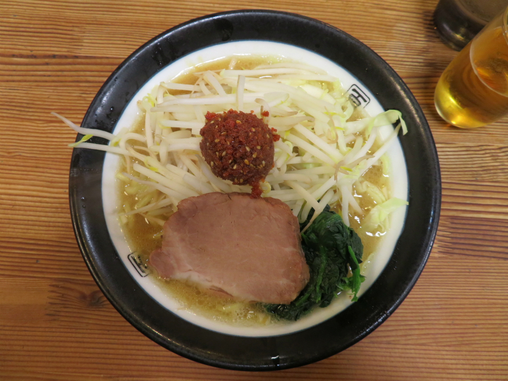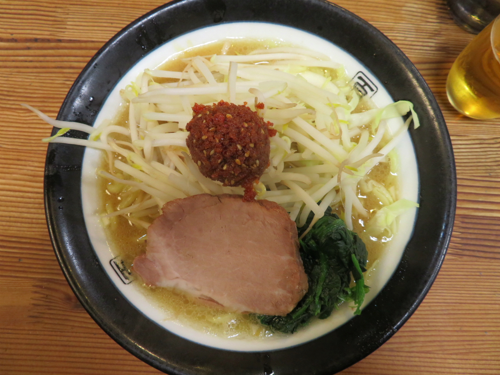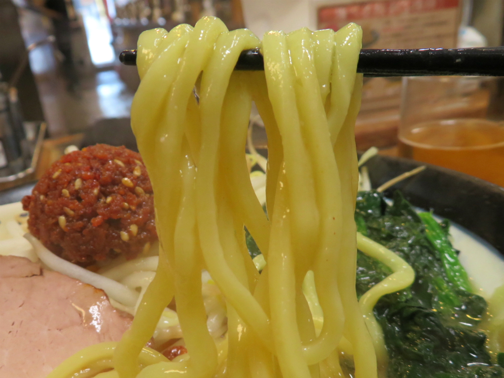 さて、「海老辛玉味噌豚骨(太麺)」。 麺はやわらかめ。活気のある店内がまさにそんな感じ、ラーメンを納める午後三時。