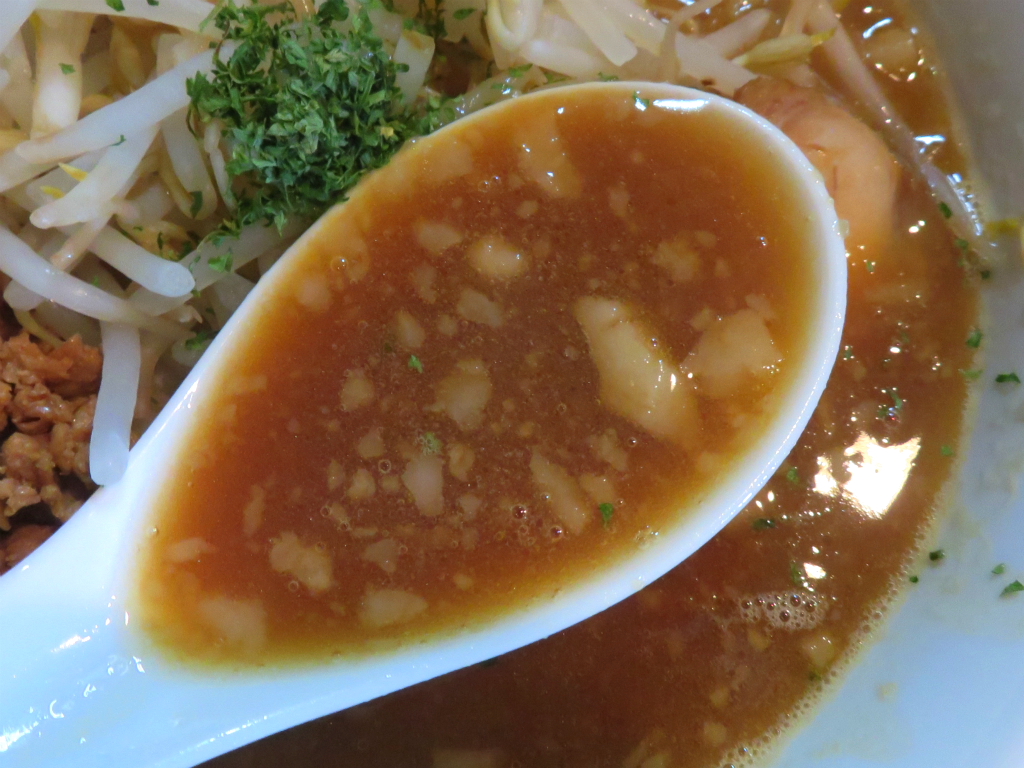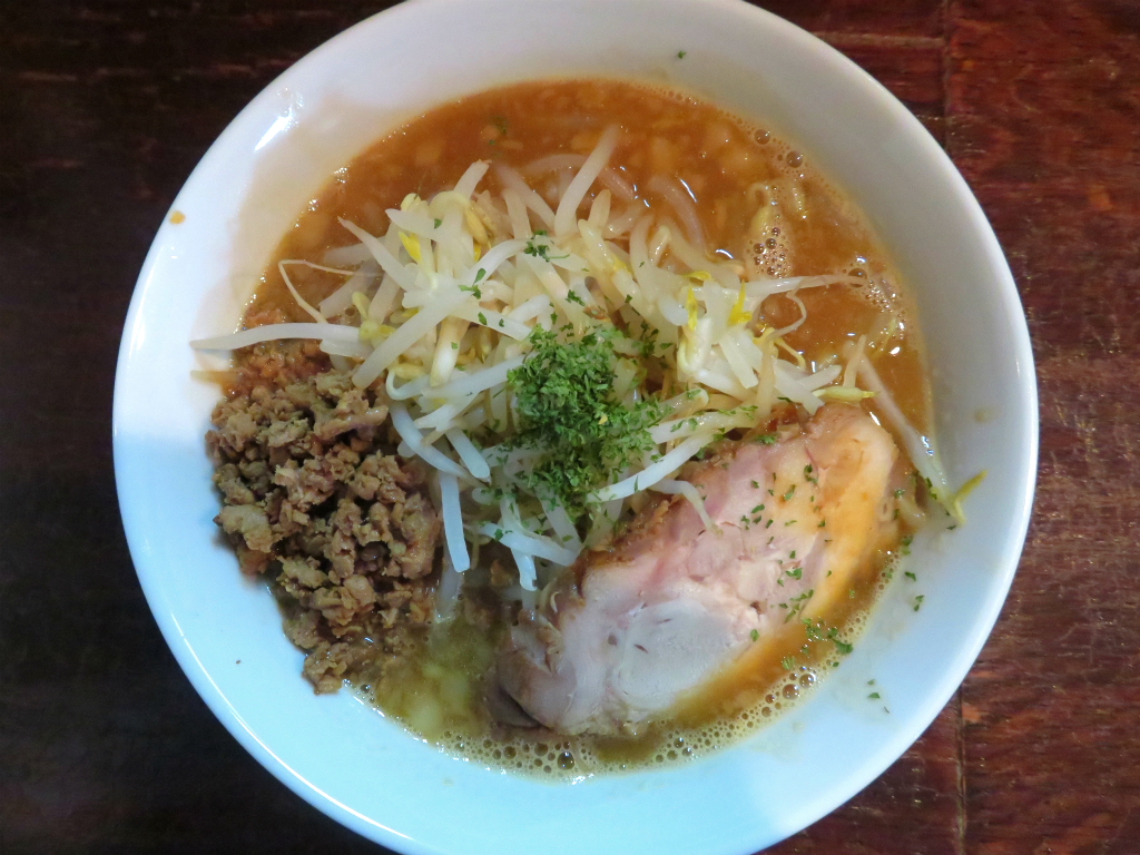 さて、「らぁめん」。ニンニクは抜いてもらってぽってりと、鶏白湯、鶏チャー、鶏そぼろで鶏三昧。おおう、入れんのかーい。