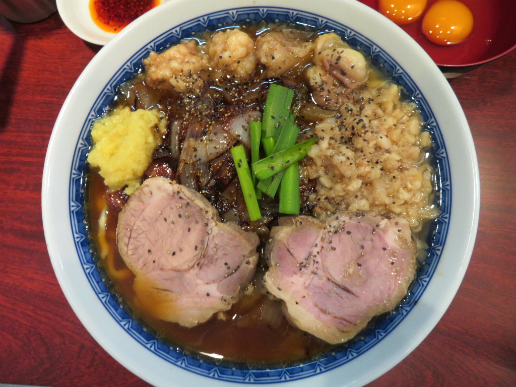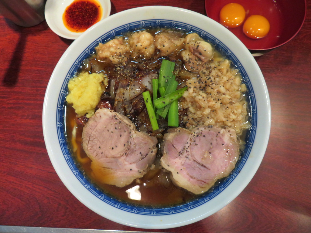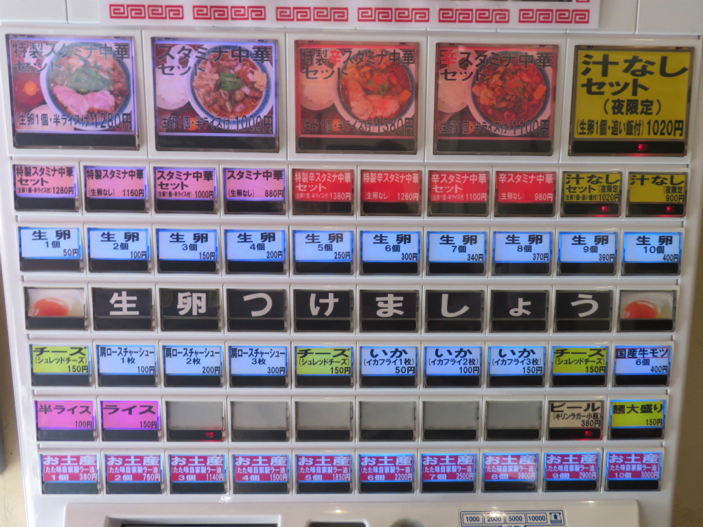 さて、「特製スタミナ中華」。 無料トッピングはしょうが、あぶら、からめ。汁なしは夜限定なので注意、券売機 右上を注視。